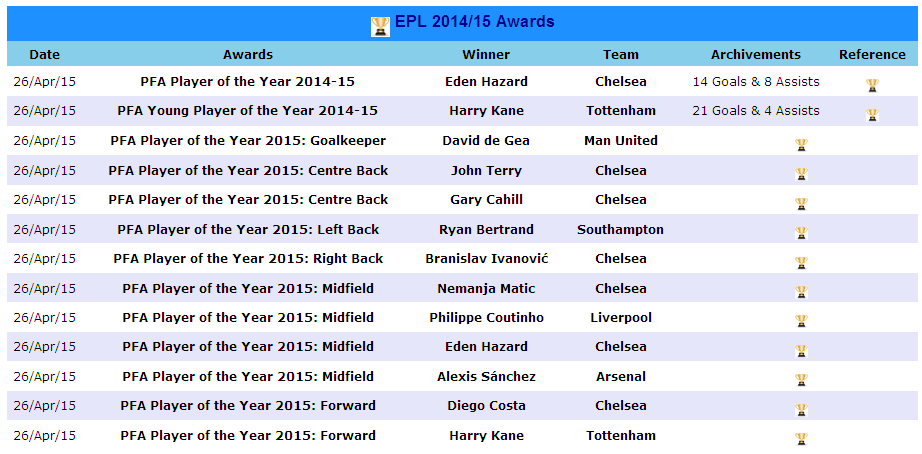 26/Apr/15 PFA (Professional Footballers' Association) Winners 2015 | ||||||